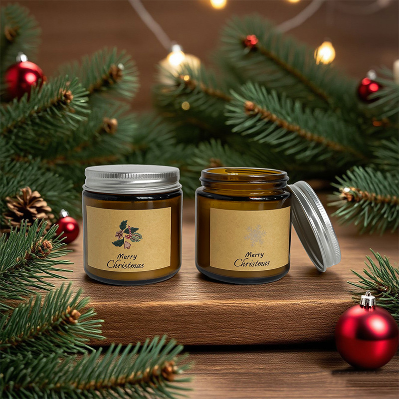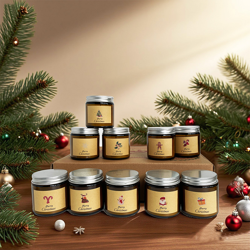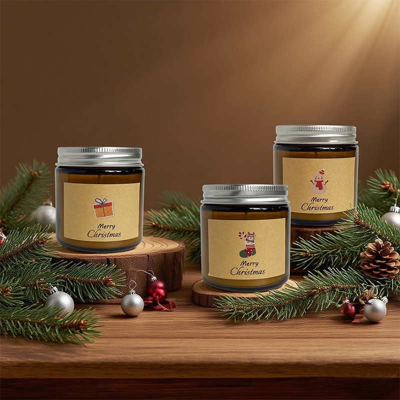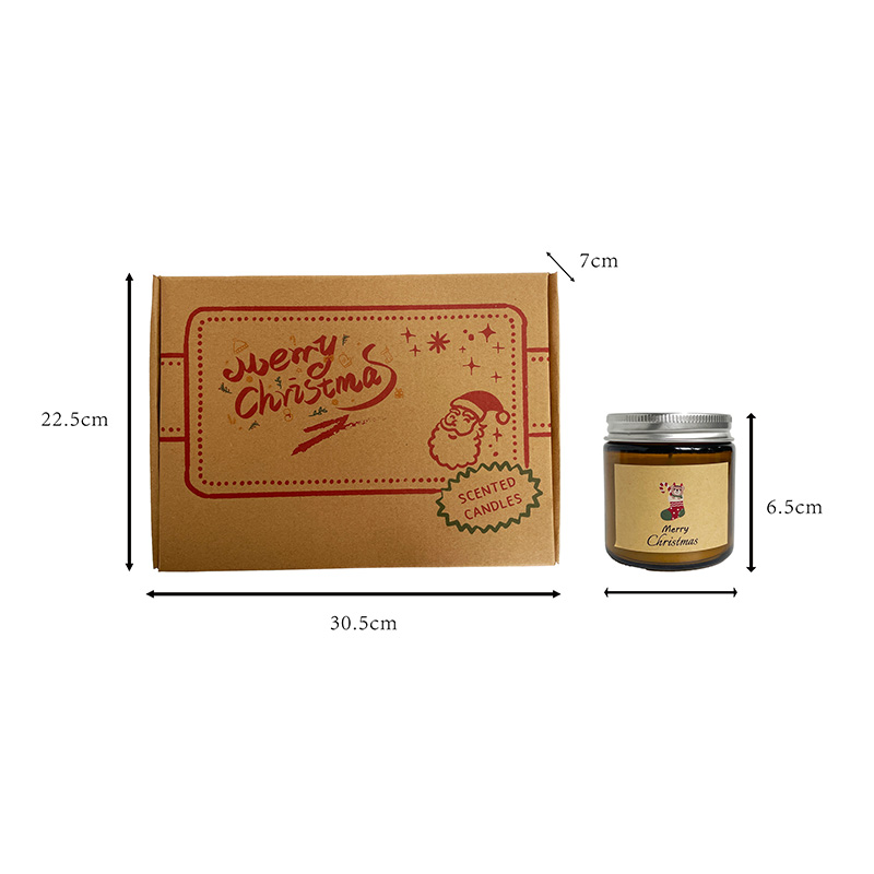 This brown Christmas scented candle gift set with kraft paper labels is made of 100% natural soy wax, which is eco-friendly and healthy. It produces almost no black smoke when burning, ensuring safety and no unpleasant odors. The candle has a net weight of 70 grams and measures 6 cm in diameter and 6.5 cm in height. It is paired with retro-style kraft paper labels printed with Christmas-themed patterns, and the overall design is simple yet full of festive atmosphere. The gift set comes in an exquisite package, making it suitable for gifting to relatives, friends, or clients as a Christmas present, or for holiday decoration.