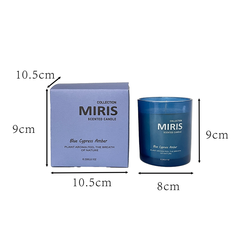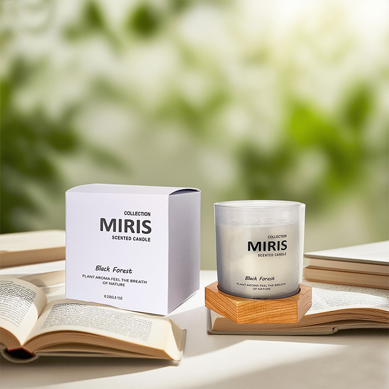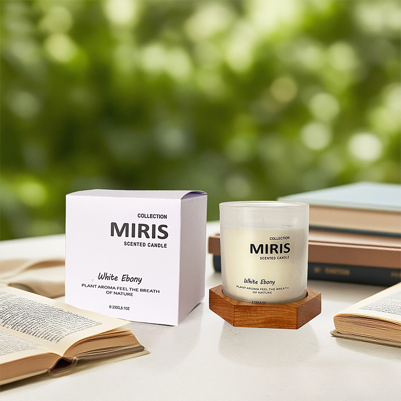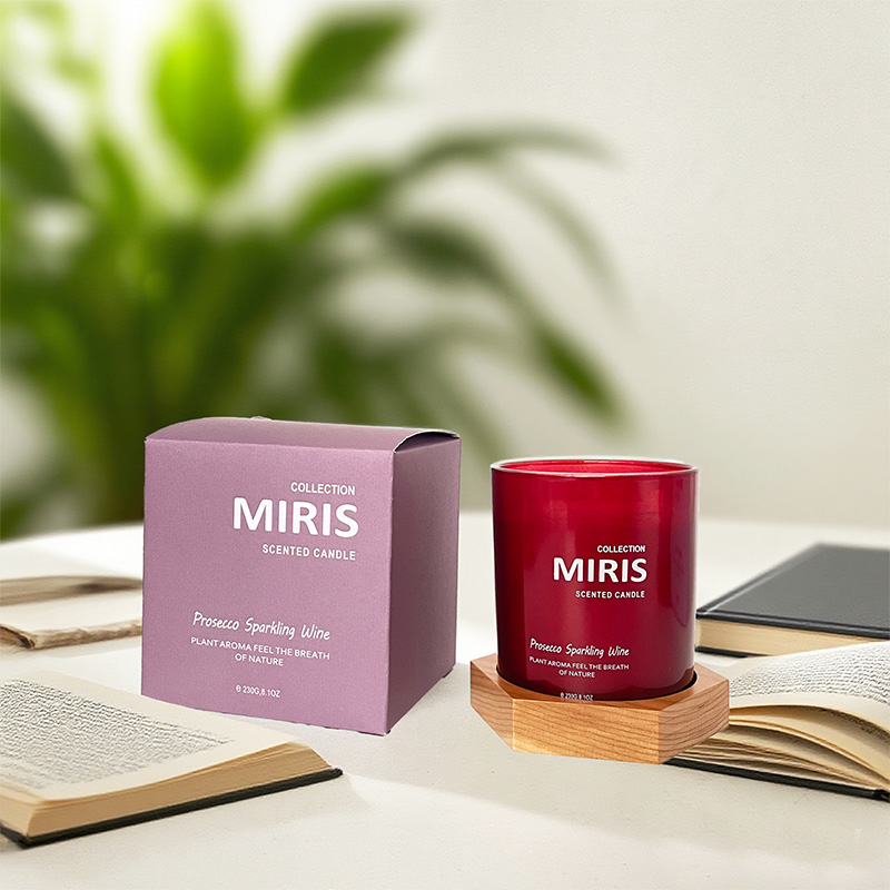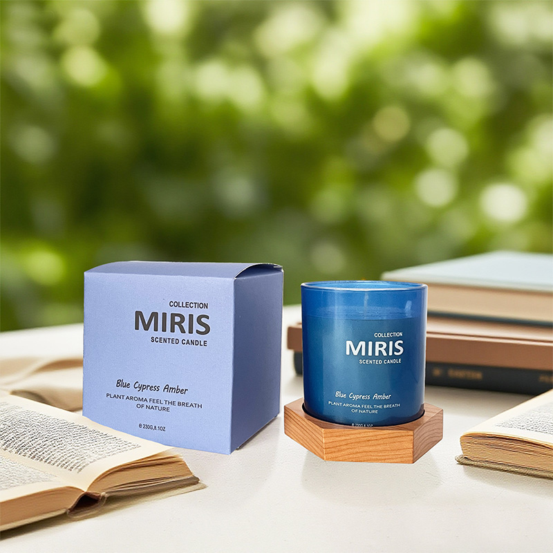 This scented candle cleverly combines modern colored printing with a natural wood base, creating a fragrance product that is both stylish and stable. The candle has a net weight of 213 grams and measures 8 cm in diameter and 9 cm in height. The jar body features bright colors and clear, eye-catching printed text, while the bottom is equipped with a matching natural solid wood base. This not only enhances overall stability but also adds a warm, natural texture.