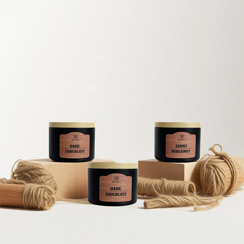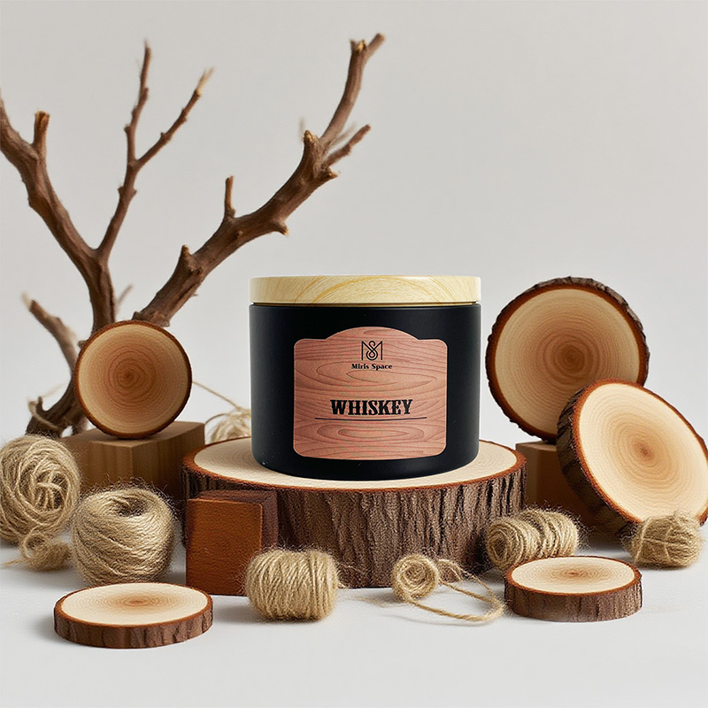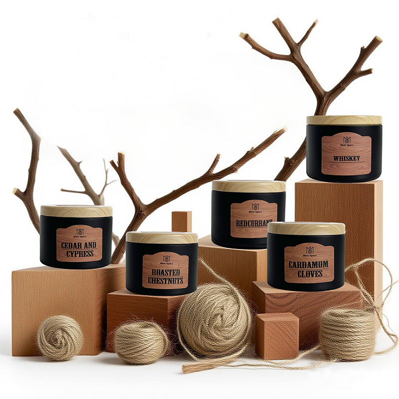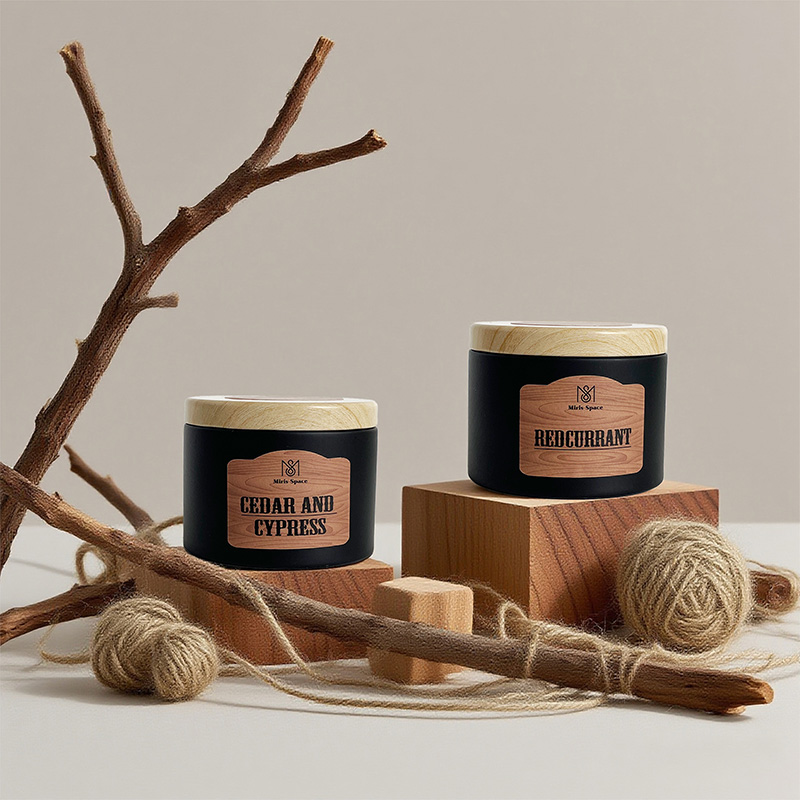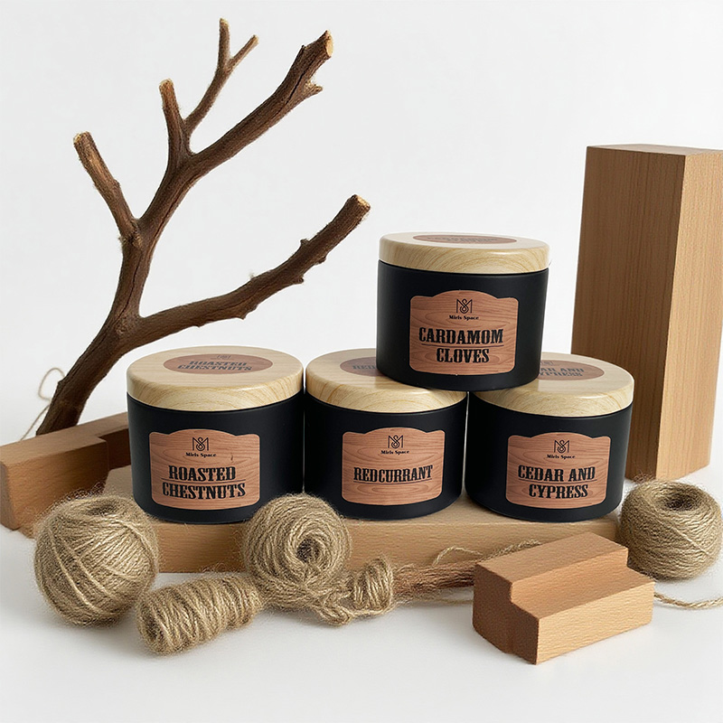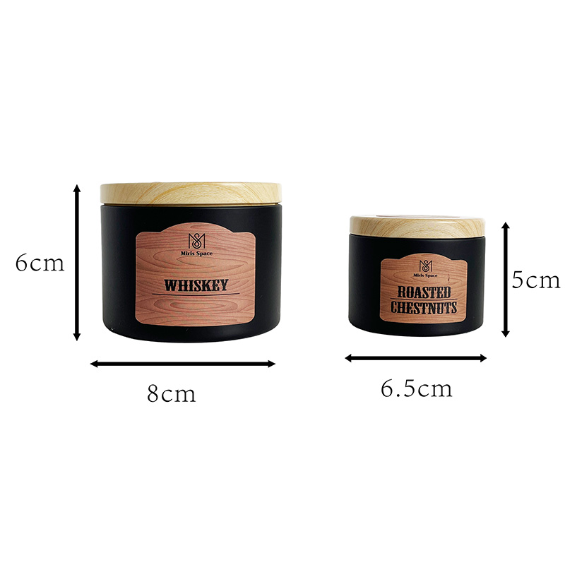 This scented candle showcases a calm and premium texture through the classic combination of its deep black glass jar and natural wooden lid. The jar body is adorned with a realistic wood-grain label, which further enhances the fusion of natural and industrial styles. Two specifications are available for selection: one has a net weight of 93 grams, with a diameter of 6.5 cm and a height of 5 cm, featuring a compact and exquisite design; the other has a net weight of 172 grams, measuring 8 cm in diameter and 6 cm in height, offering a more substantial feel. Both versions are made of 100% natural soy wax, ensuring clean burning, environmental friendliness and health safety.