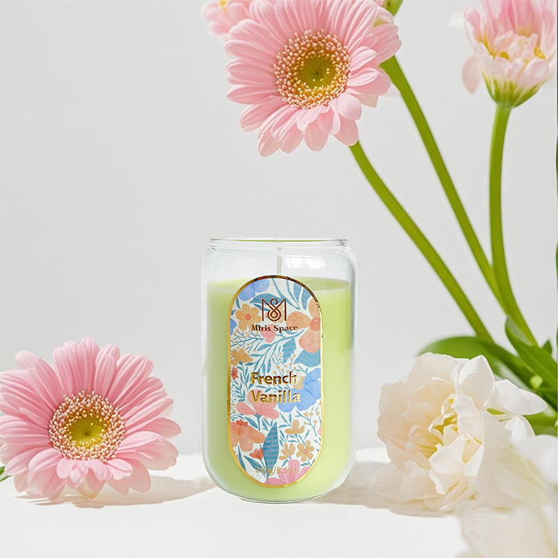 This spring-inspired scented candle is made from natural soy wax, delivering a pure and warm burning experience. With a net weight of 306 grams, the candle measures 7.5 cm in diameter and 11.4 cm in height, and comes in a transparent glass jar. The jar is adorned with a gold-stamped label featuring a "Spring Garden" theme, exuding romance and elegance.