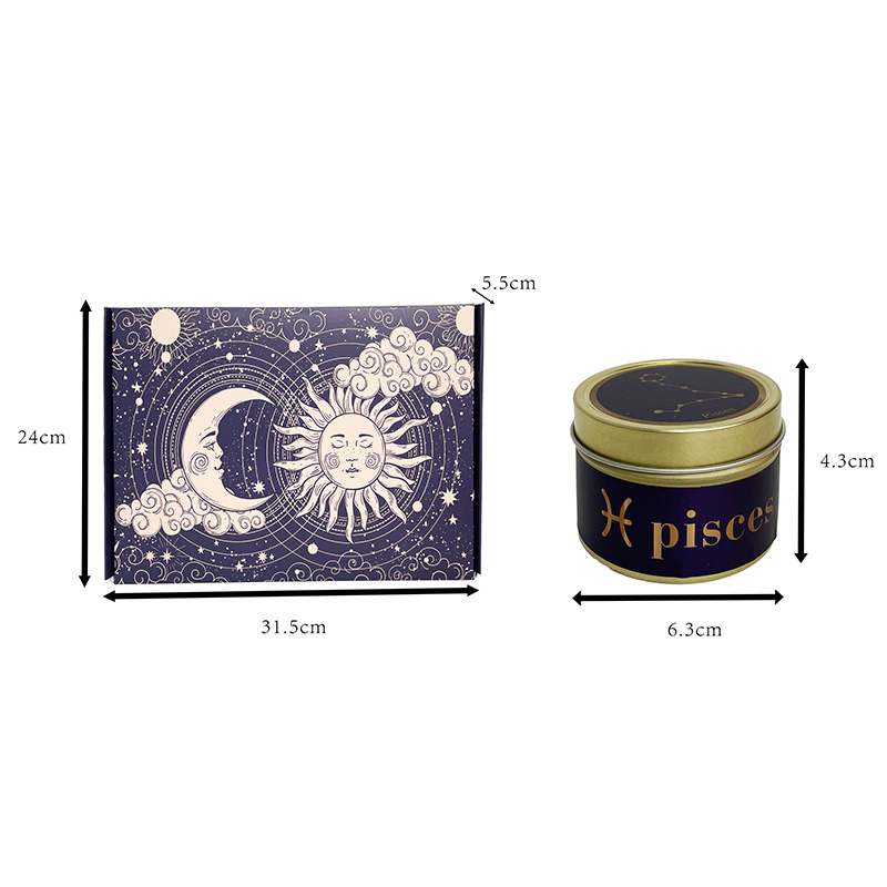 This product is a complete constellation-themed fragrance gift set, containing 12 mini tin-can scented candles corresponding to different constellations. Each candle is made of natural soy wax, making it a heartfelt and mysterious healing gift. A single candle has a net weight of 111 grams and comes in an exquisite tin can measuring 6.3 cm in diameter and 4.3 cm in height. The 12 tin cans are decorated with corresponding constellation symbols and are collectively stored in an exquisitely designed gift box, offering a surprising unboxing experience.